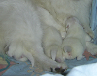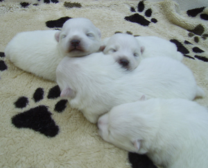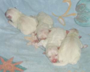 Die Hündin "Jenna" (rotes Halsband) wiegt jetzt 1480g (Geburtsgewicht: 140g).