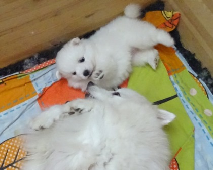 Ein 2. Welpe?? Nein... der ein paar Stunden zuvor geborene Sohn von Zazou darf zeitweise Geschwisterersatz für unser Einzel-Mädchen spielen :)