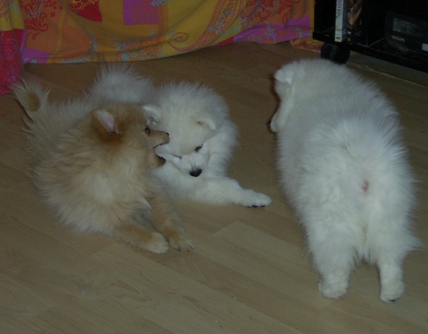 Meeting mit den neuen Freunden (rechts das größere Mädchen und der Junge aus unserem Y-Wurf)