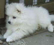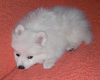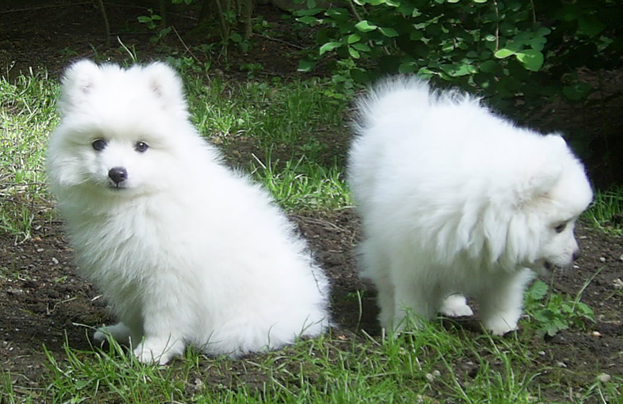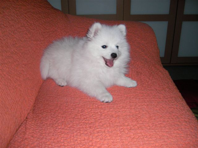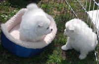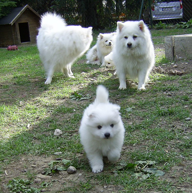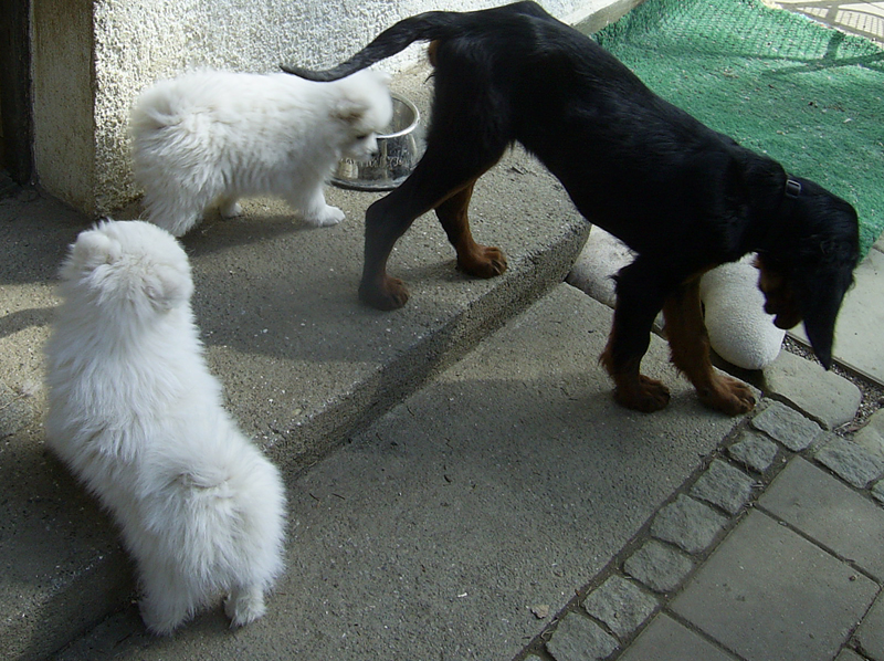 | Erstes Kennenlernen | mit vier Wochen | Die zukünftige Familie des kleinen Rüden (vorne Famey) | ||